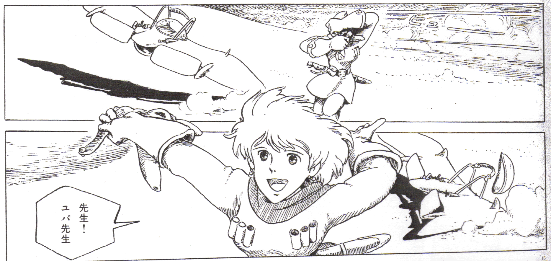 Afterwards, Nausicaä departed to join a fleet of airships from the surrounding tiny nations in battle- some time after joining up with the fleet, a rogue gunship attacks its barges- it’s Rastel’s brother, who shoots and quite badly damages the Torumekian barge carrying Kushana, the general who led the foolhardy excursion to the Valley of the wind- her assistant takes the helm of the ship, and with that, we’re one hundred pages into Nausicaä of the Valley of the Wind.
